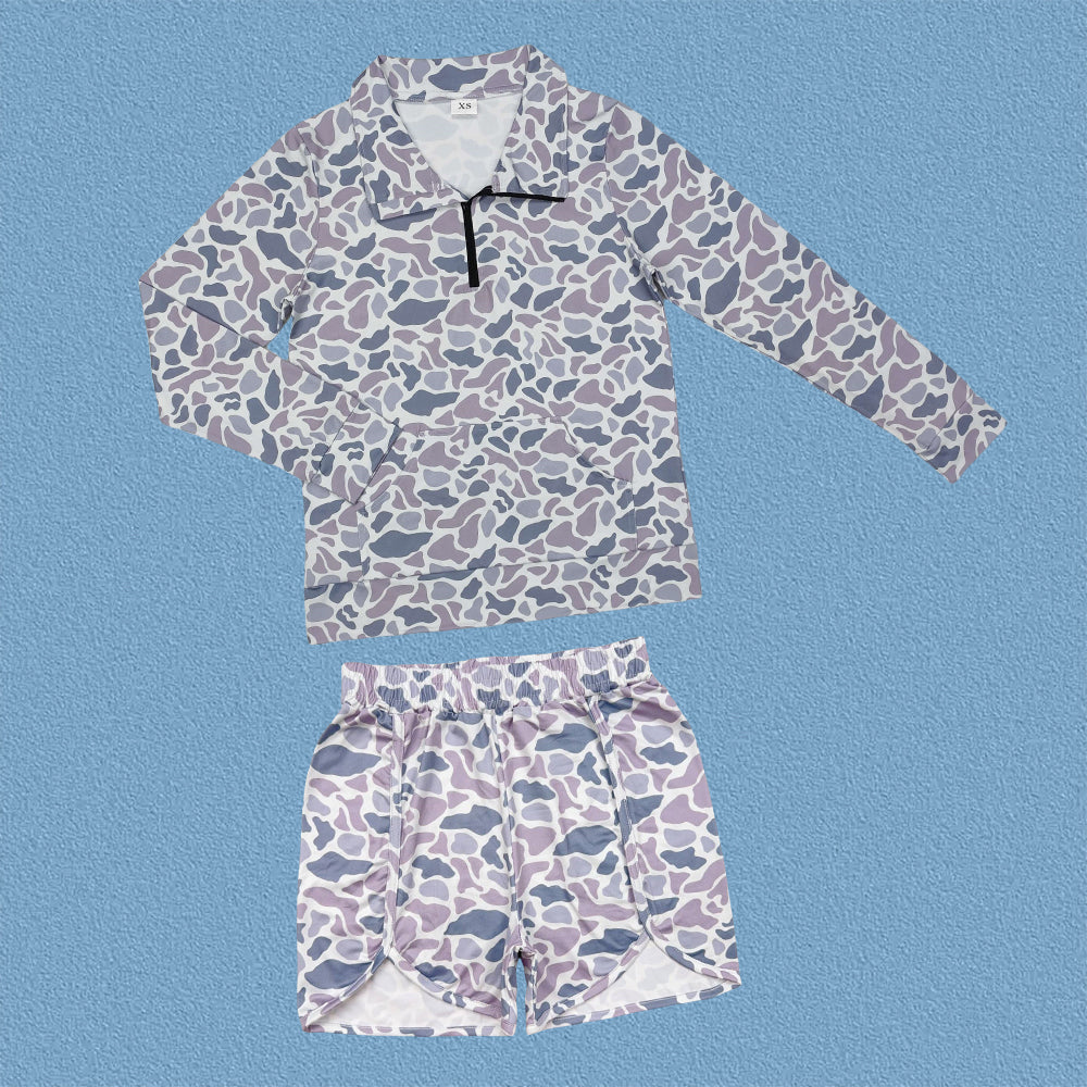 Adult Women Hunitng Camo Long Sleeve Zipper Pullover Top With Shorts Outfit