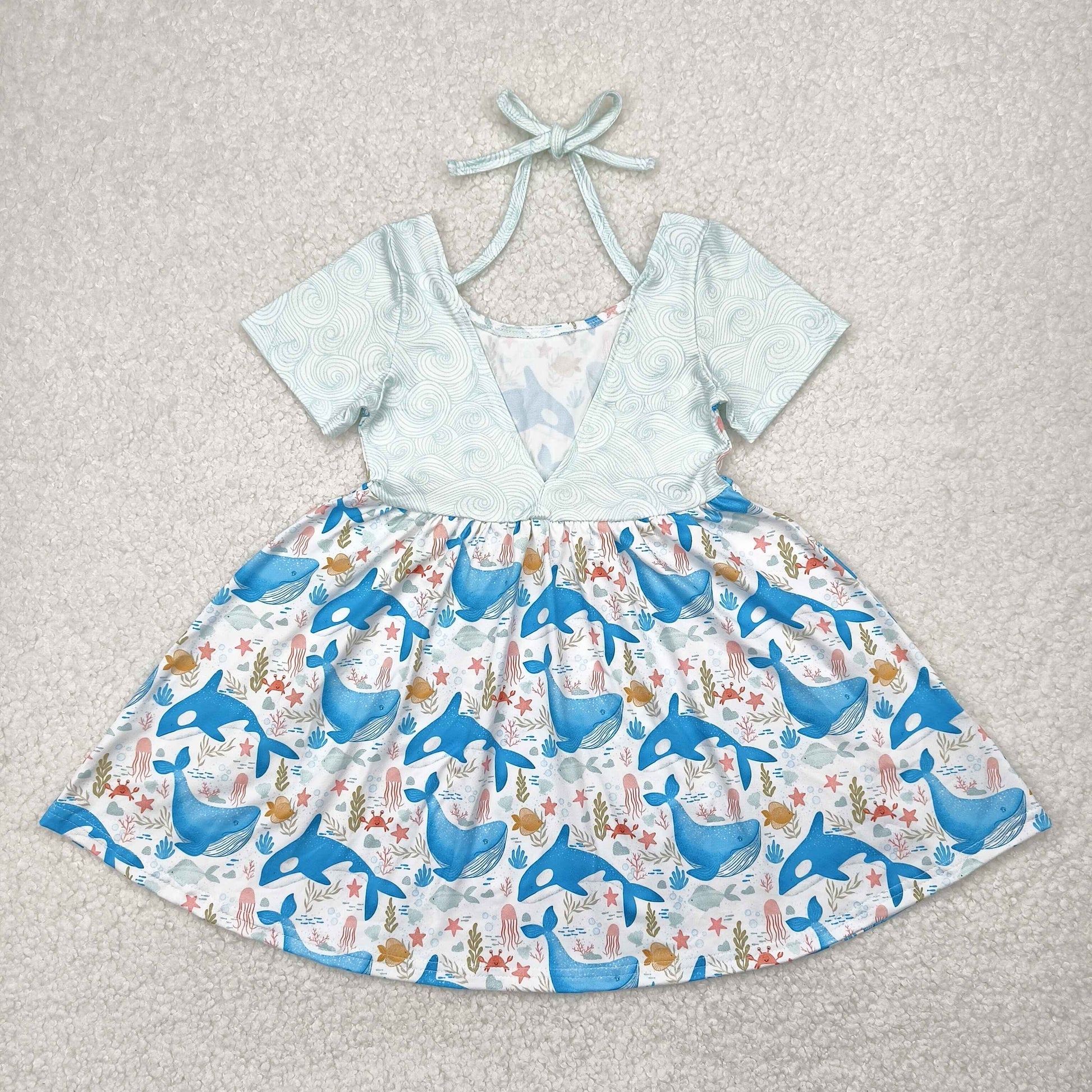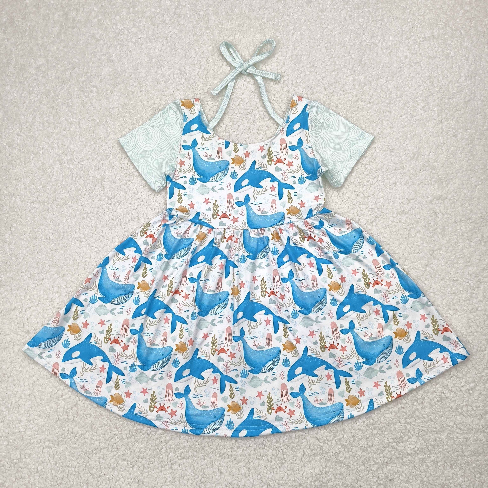 Baby Girls Light Blue Short Sleeves Floral Whale Dress