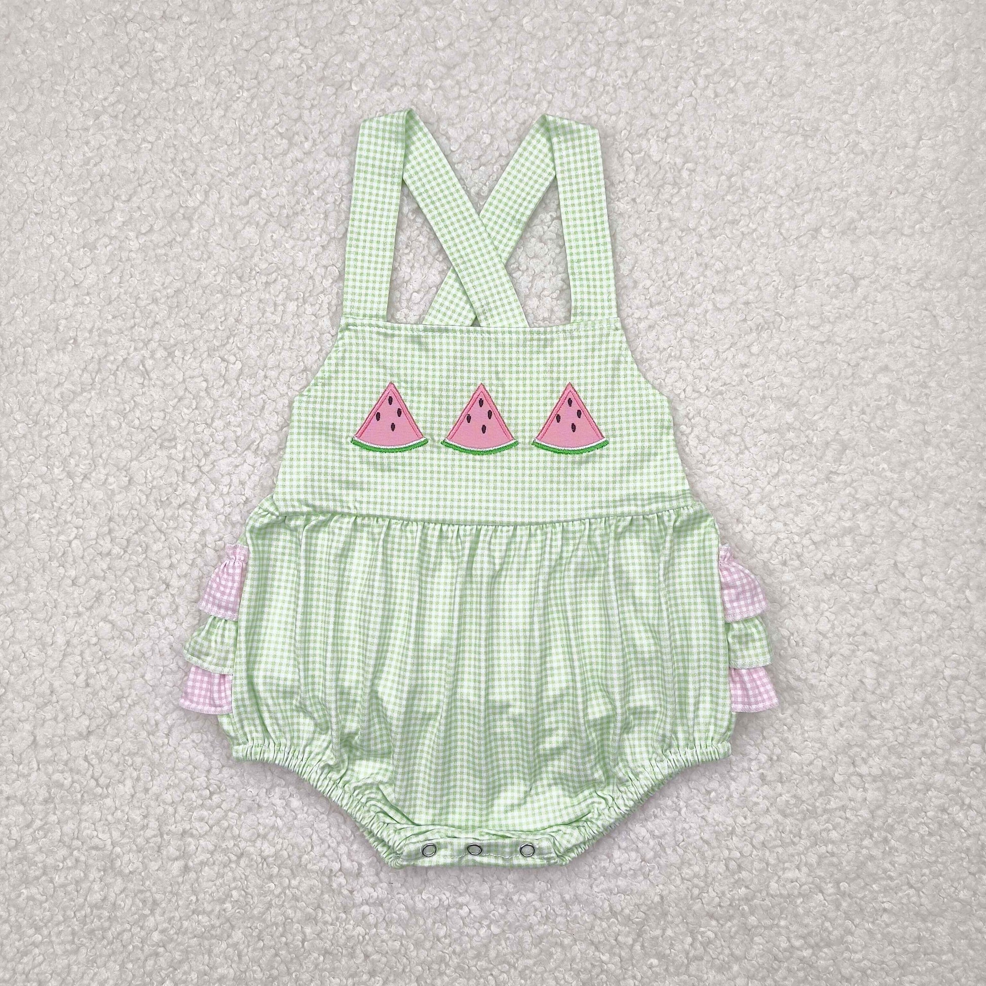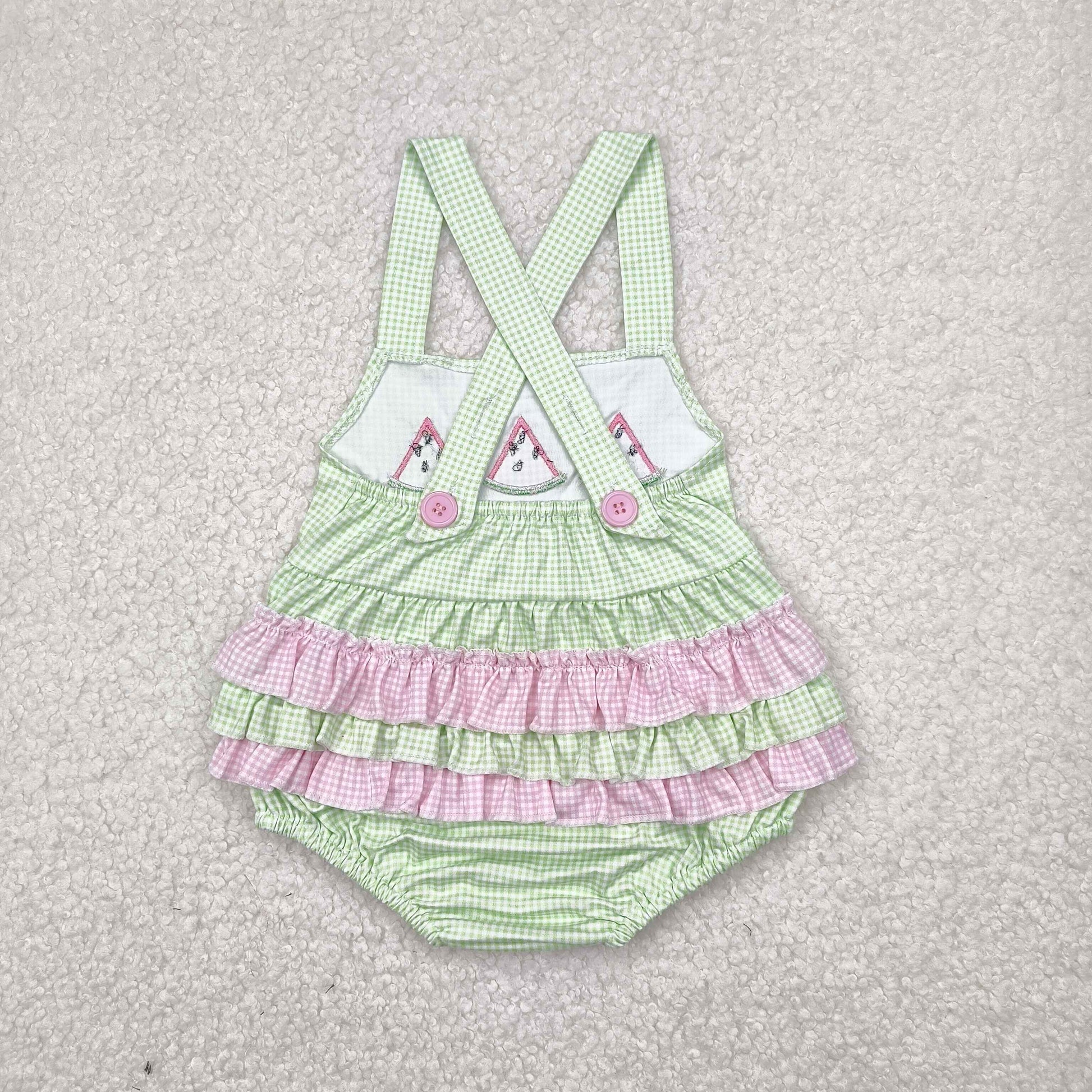 Baby Girls Pink Flutter Sleeves Watermelon Green Plaid Rompers