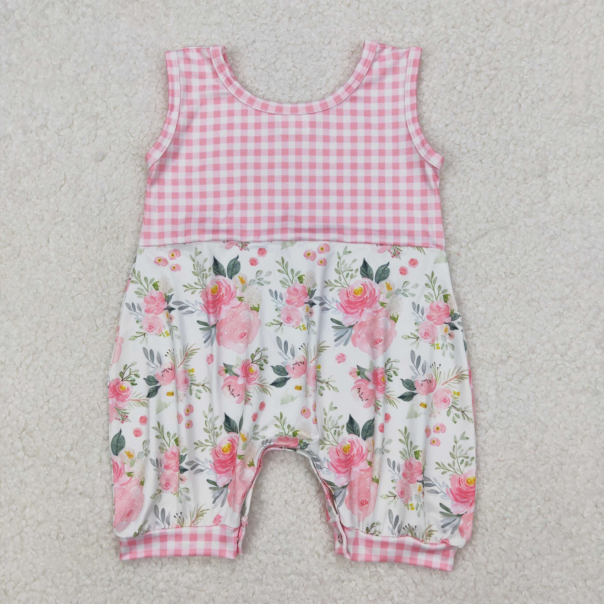 Baby Girls Pink Plaid Sleeveless Floral Print Rompers