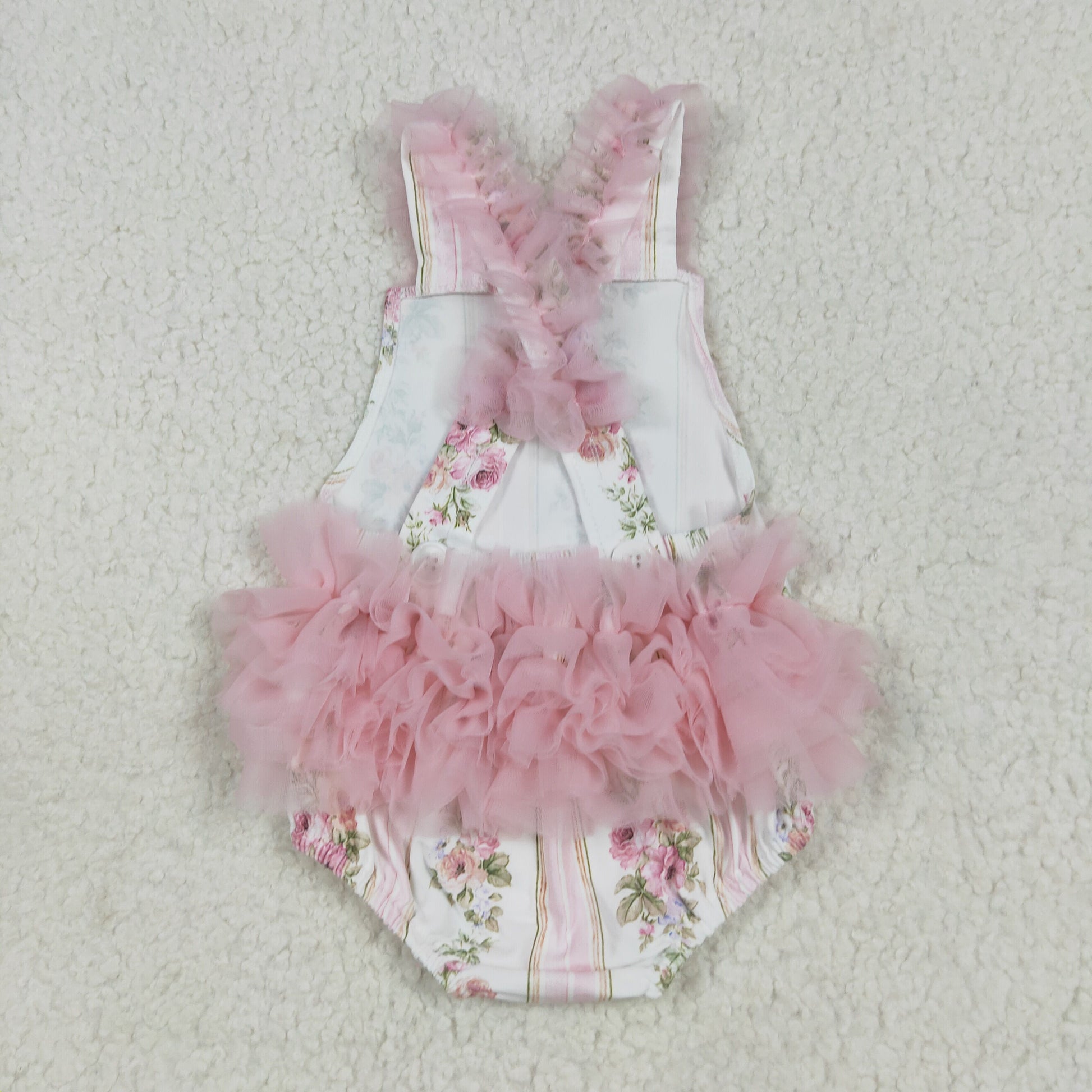 Baby Infant Girls Pink Tulle Strap Floral Stripe Ruffle Rompers