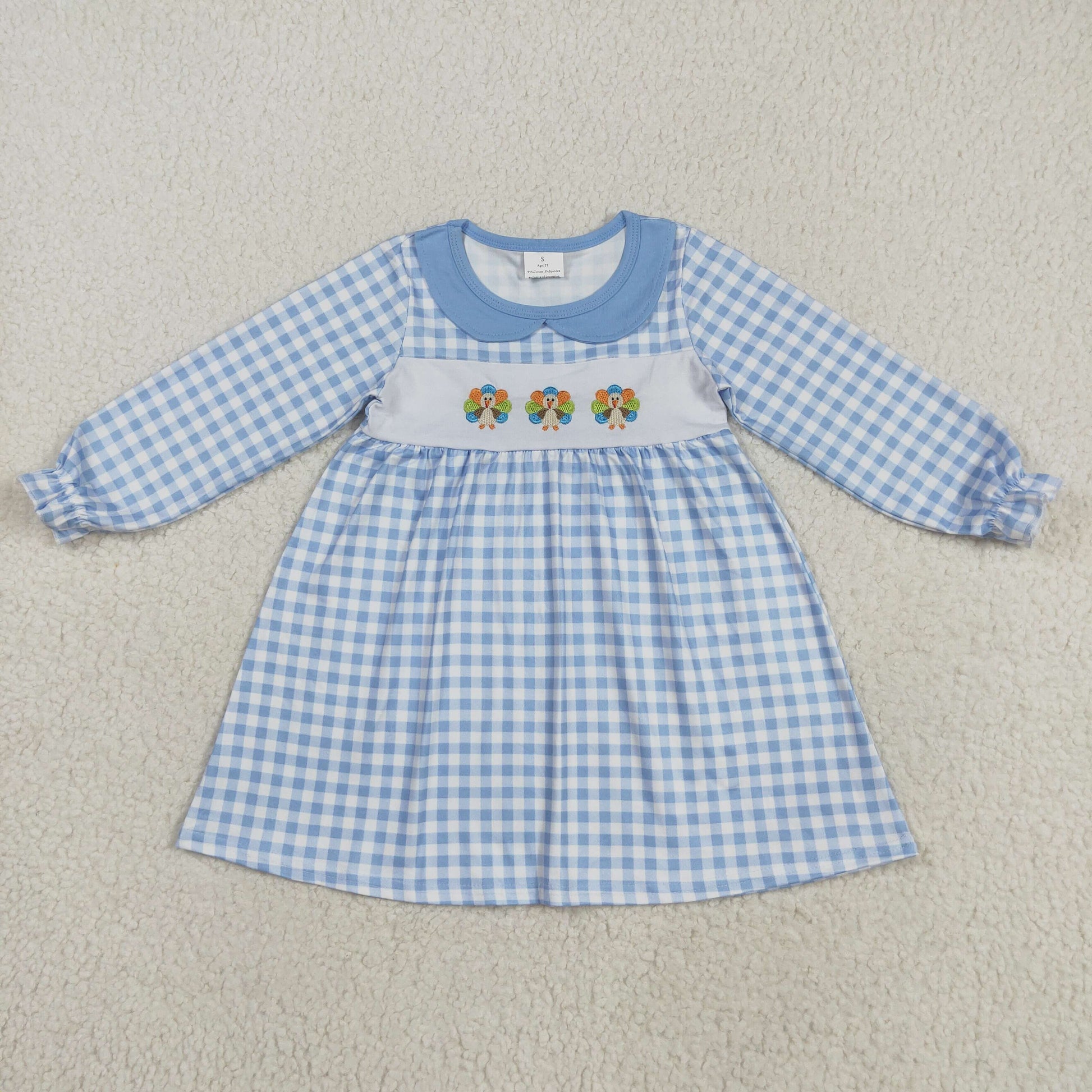 GLD1070 Kids Girls Thanksgiving Turkey Blue Gingham Long Sleeve Dress