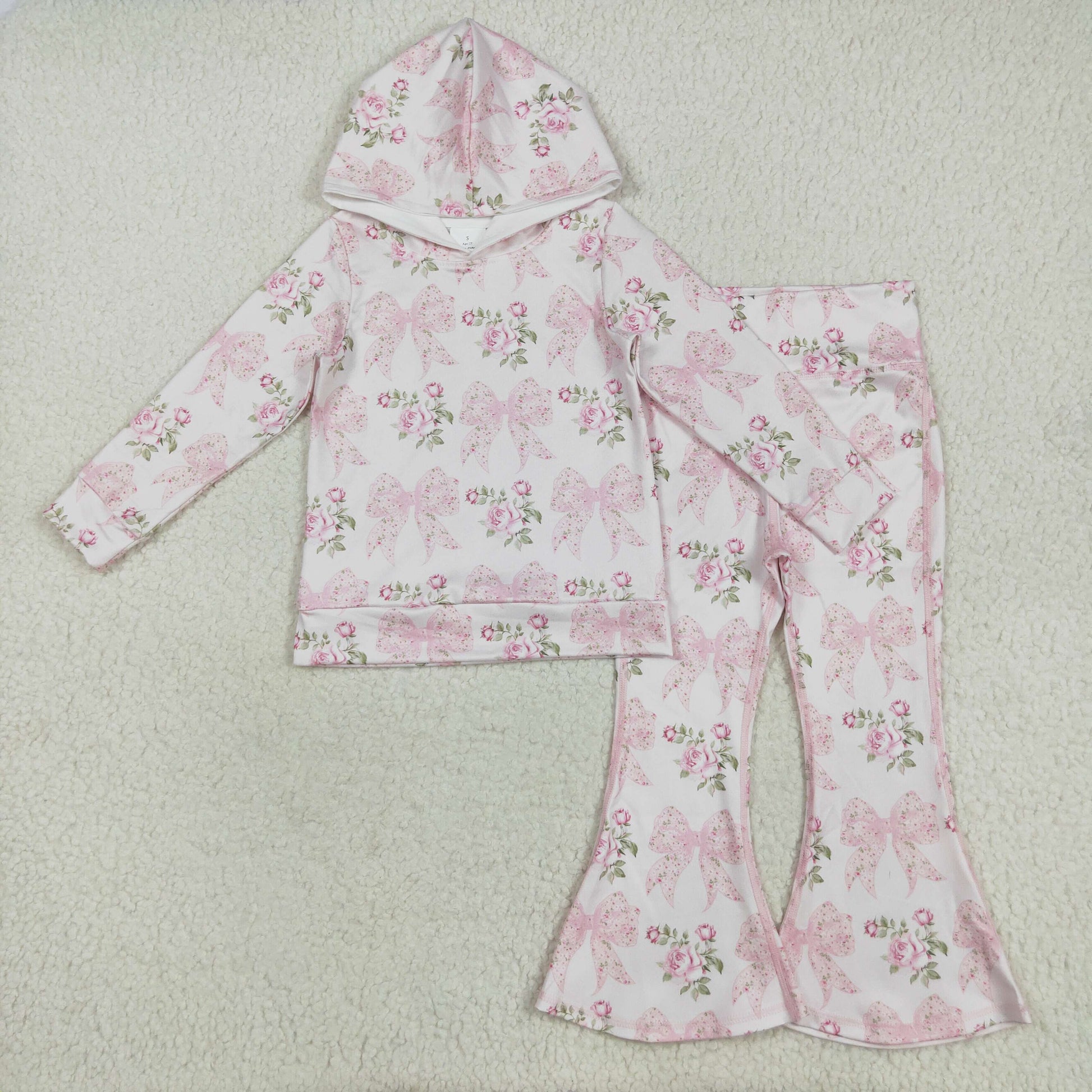 Kids Girls Pink Bow Floral Hoodie Top Pants Set