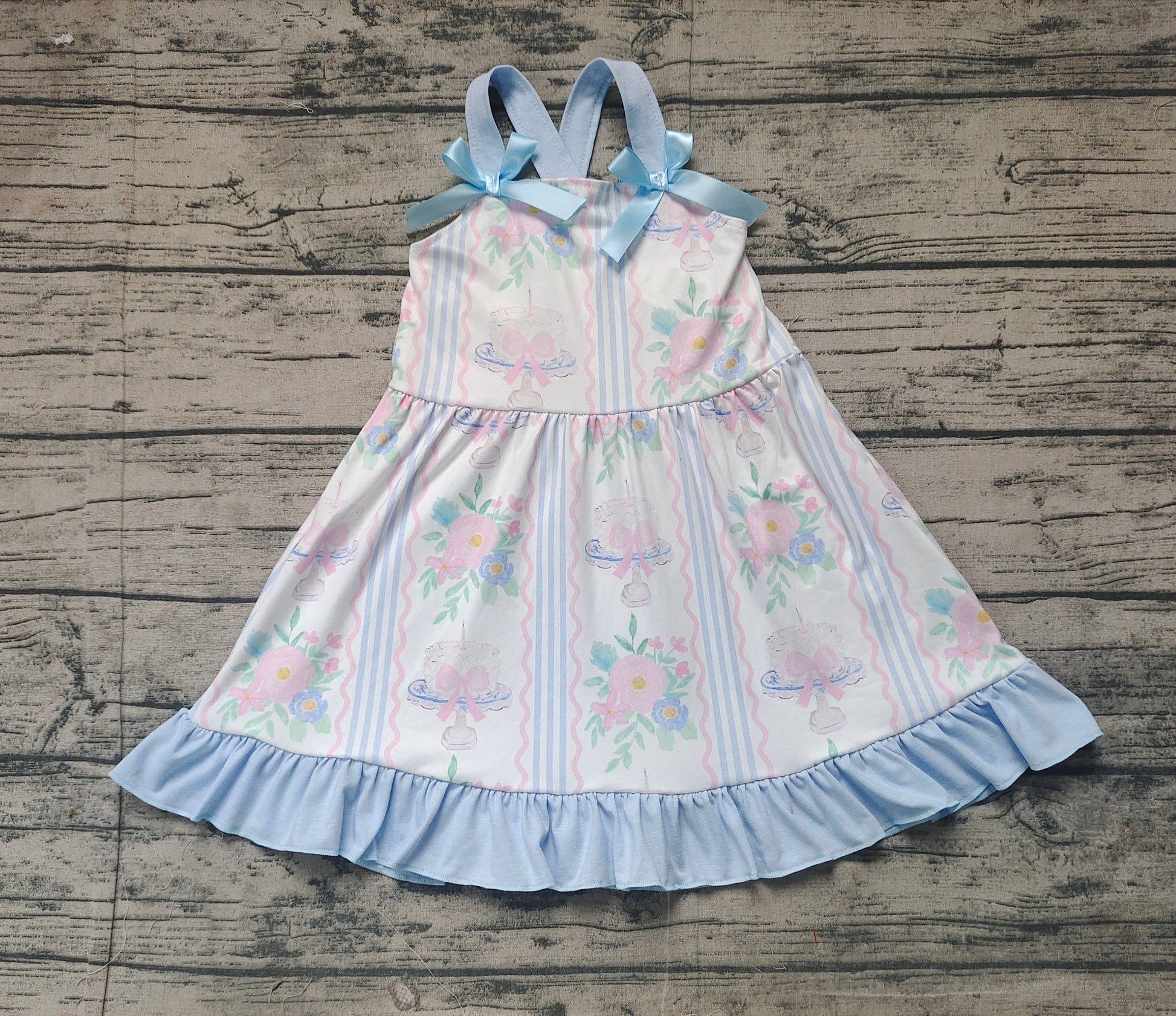 Baby Girls Blue Strap Bows Pink Floral Stripe Dress Preorder