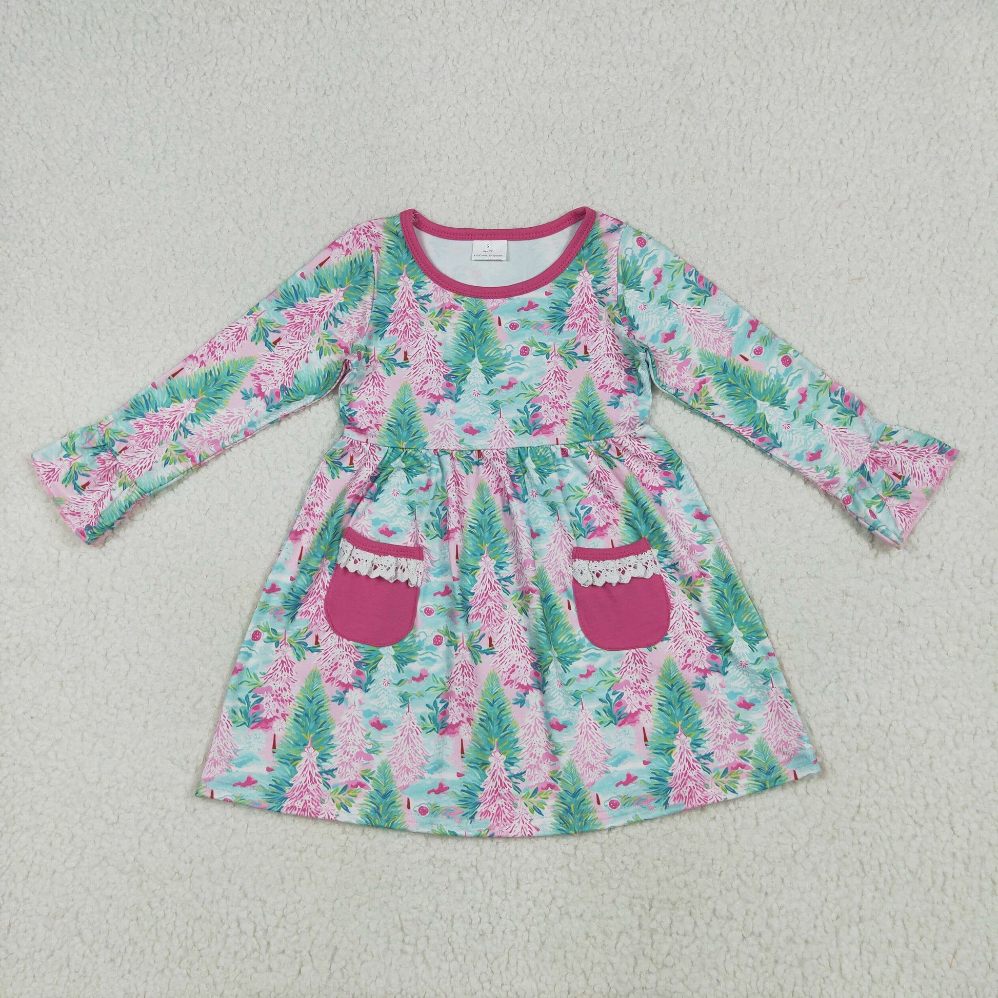Kdis Girls Christmas Tree Long Sleeve Dress With Pocket