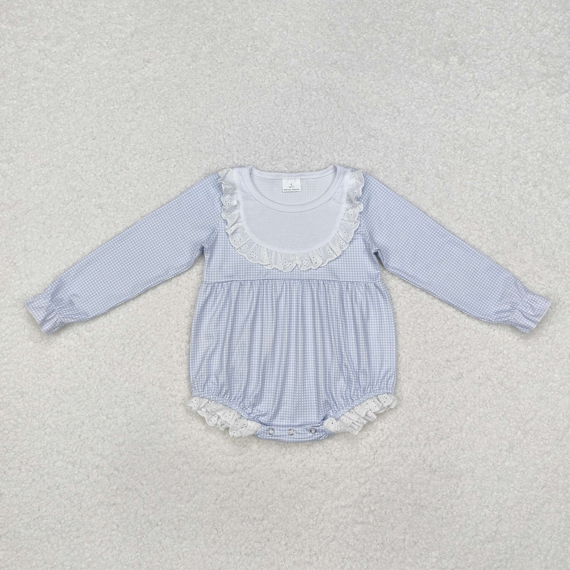 LR0986 Newborn Baby Girls Blue Gingham Long Sleeve Romper With Lace Ruffle