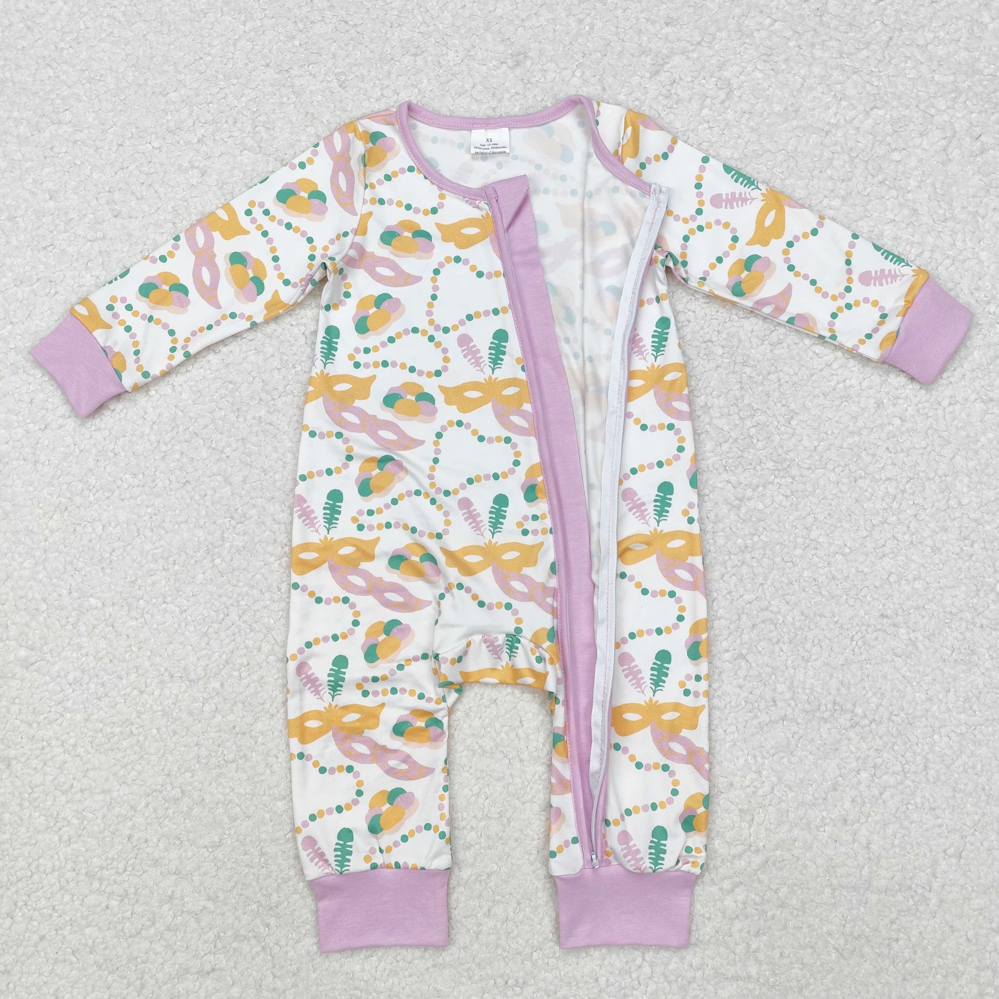 Baby Girls Long Sleeves Zipper Rompers Mosks Print Mardi Gras Romper
