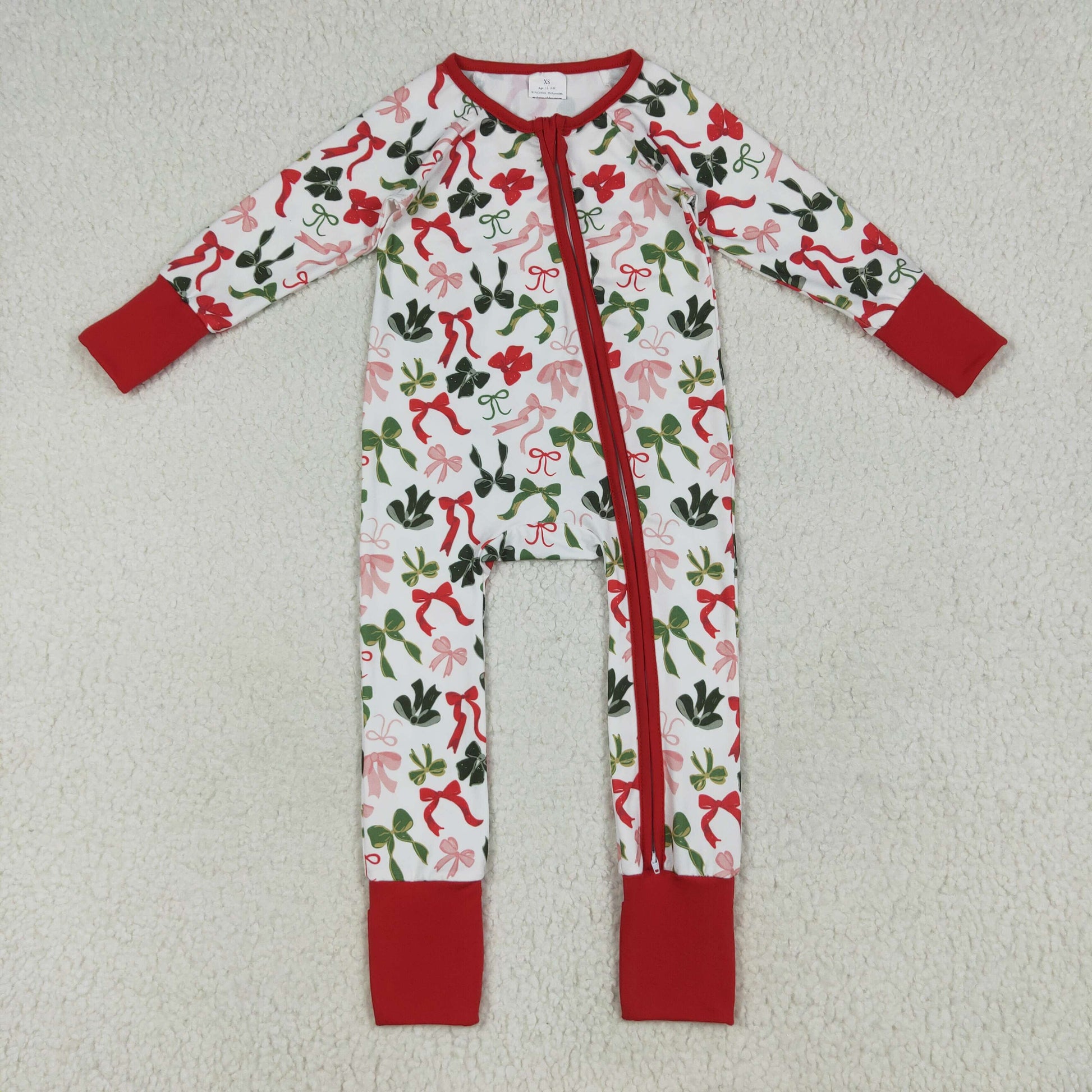 LR2203 Baby Girls Christmas Bow Long Sleeve Zip Footie Romper