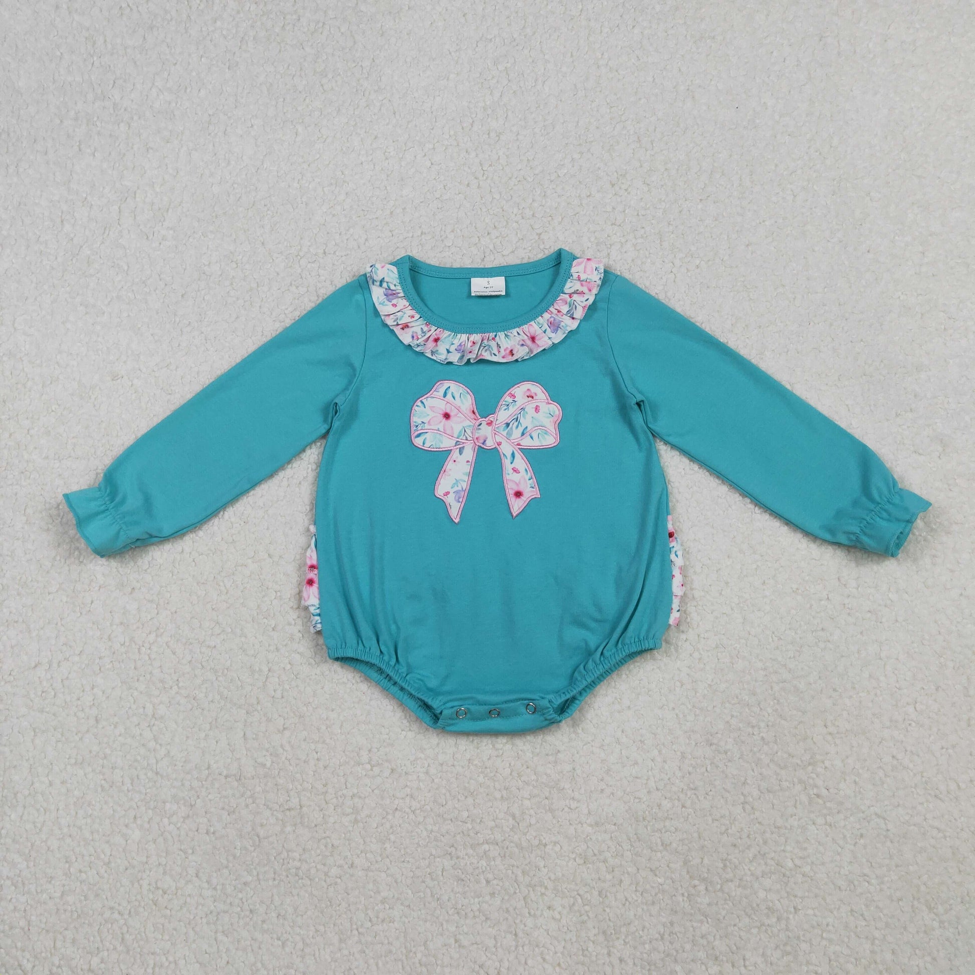 LR2432 Baby Girls Floral Bow Long Sleeve Bubble Romper With Ruffle On The Back