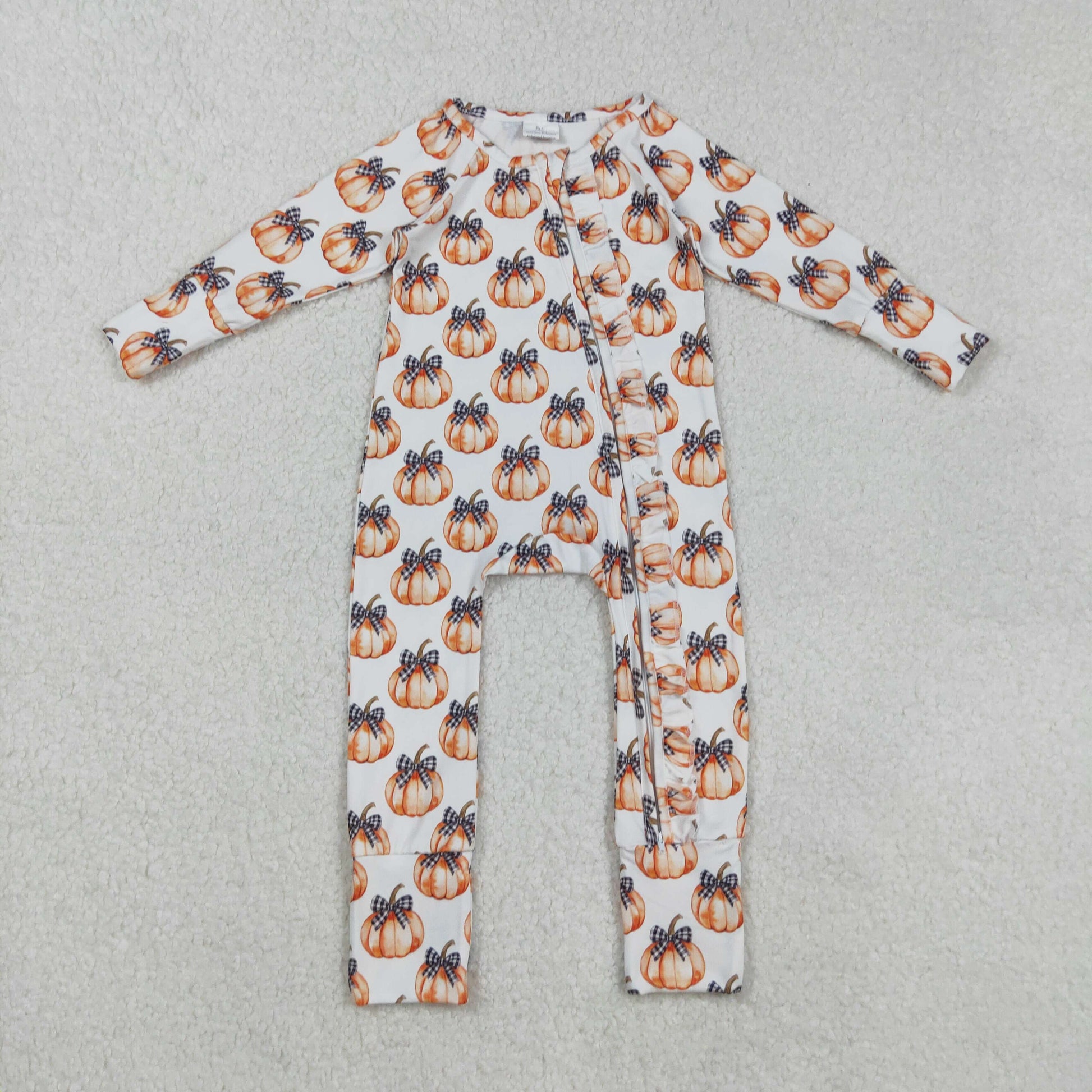 LR2557 Baby Girls Pumpkin Black Bow Long Sleeve Zip Romper