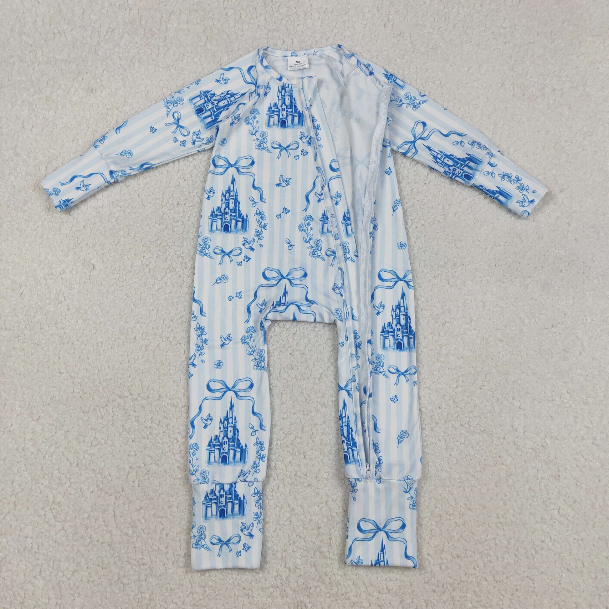 LR2661 Baby Girls Blue castle Long Sleeve Zipper Romper