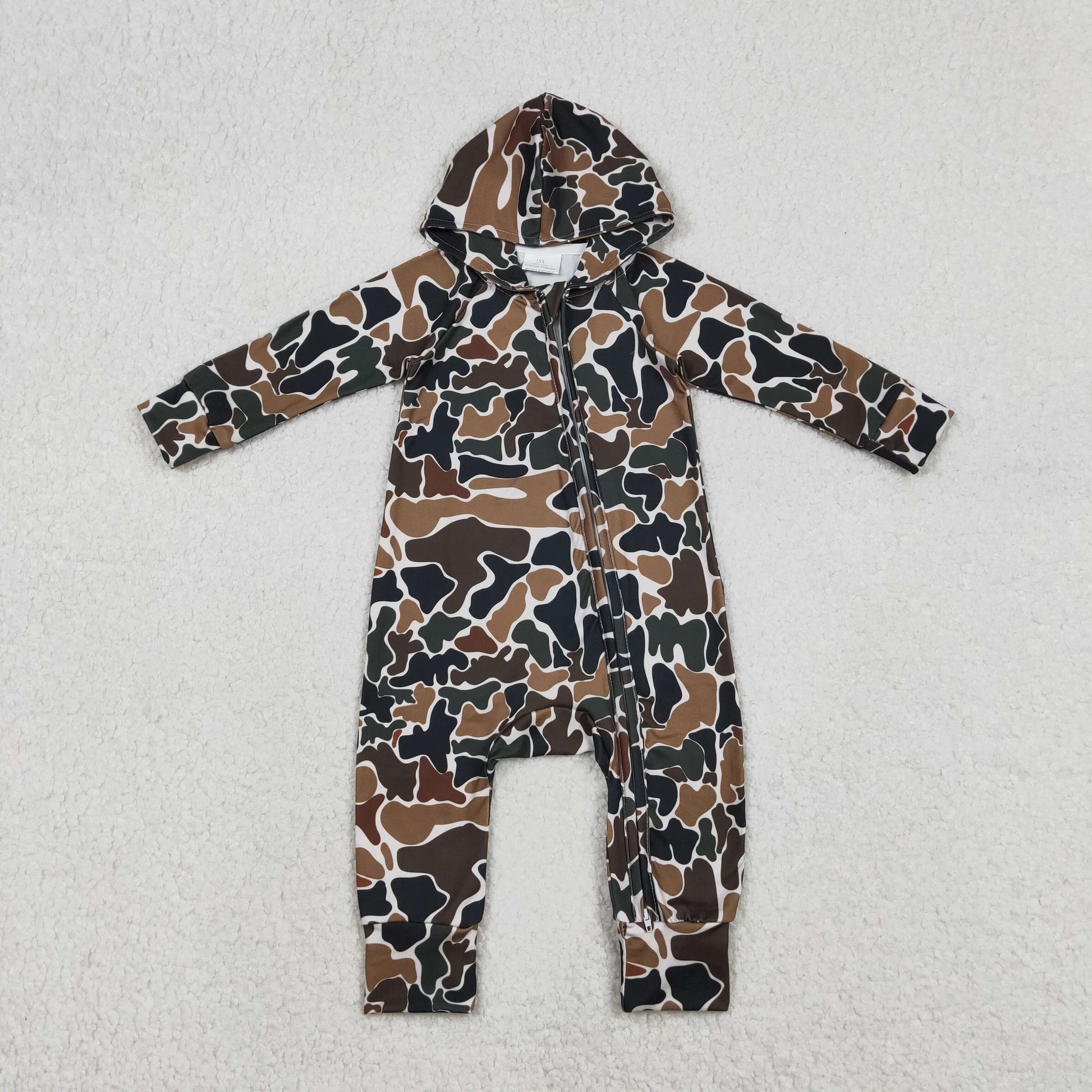 LR2815 Baby Boys Brown Camo Long Sleeve Zipper Hooded Romper