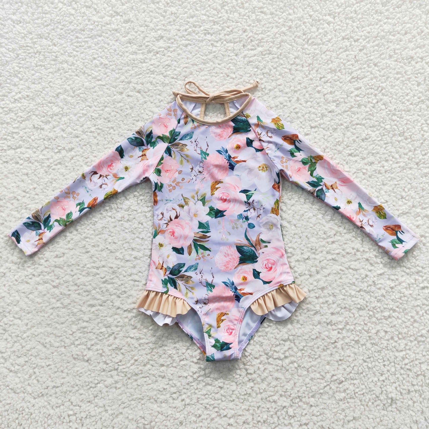 S0085 Girls Long Sleeve Rose Flower One-piece Swimsuit