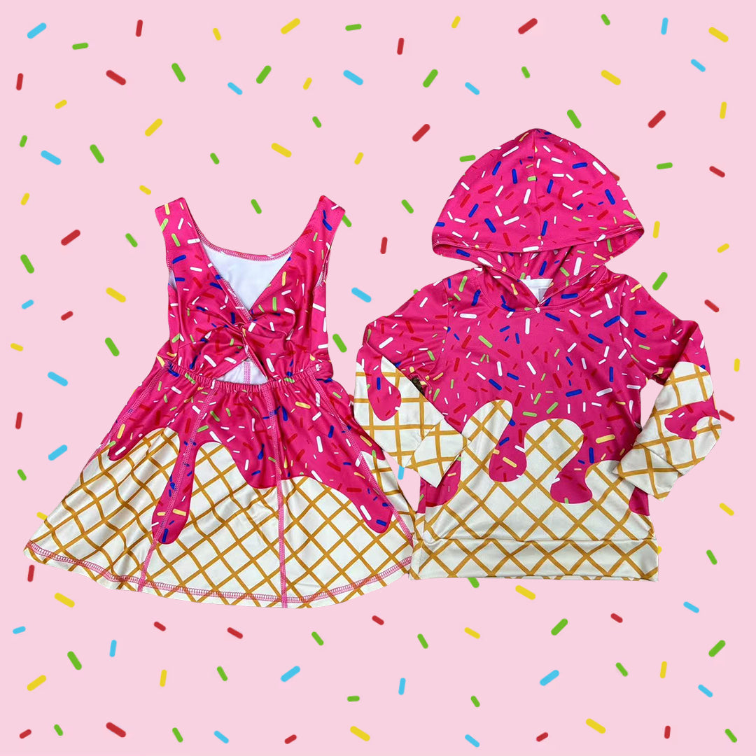 Sibling Baby Dark Hot Pink Color Ice Cream Drip Hoodie Top and Active Dress