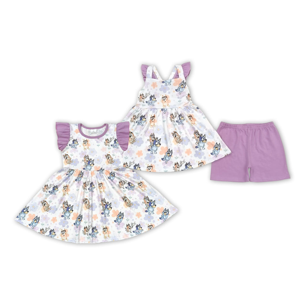 Sister Cartoon Dog Tunic Top Ruffle Shorts Set and Dress