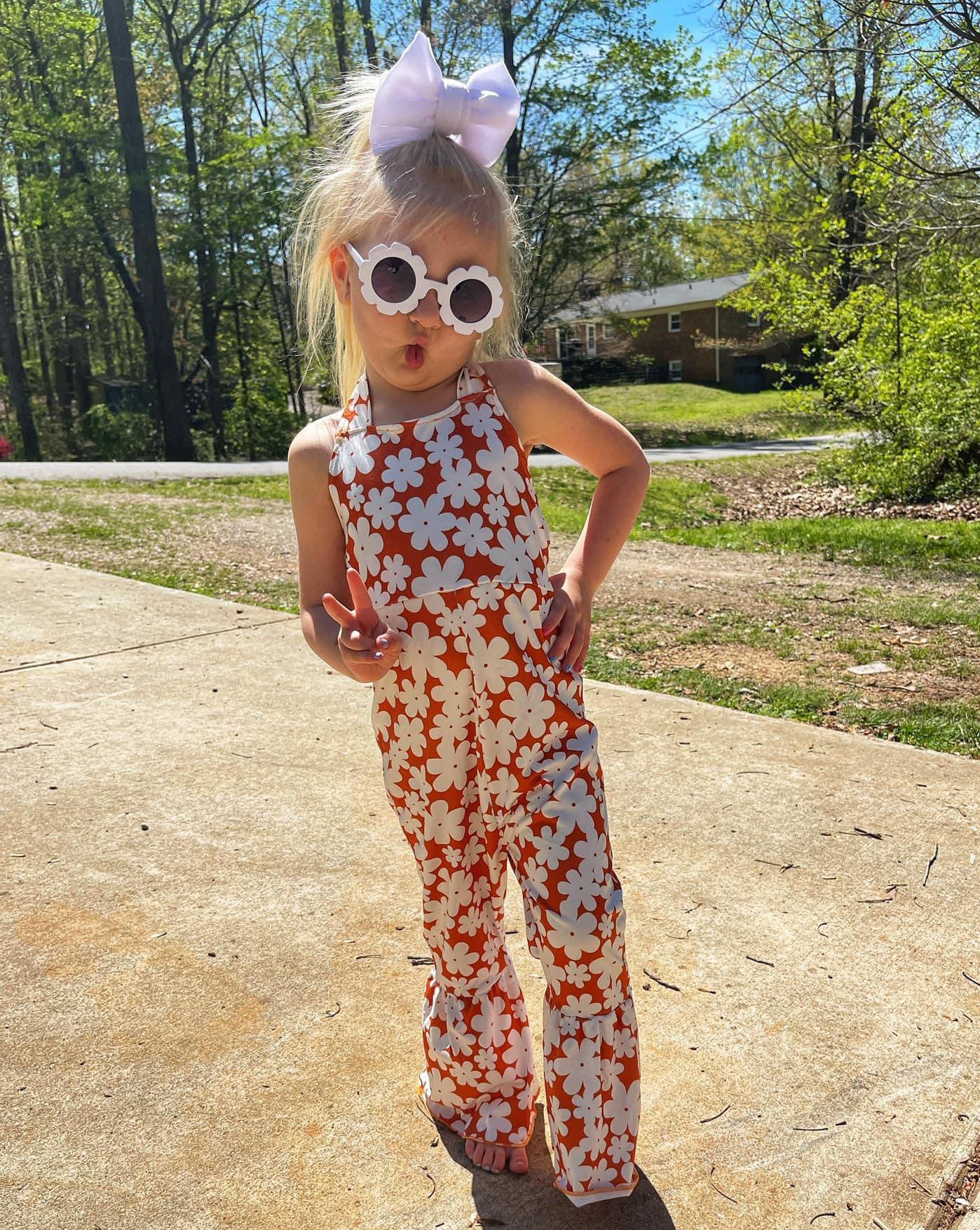 She'll shine like the sun in this cute and comfy summer jumpsuit! Made from soft milk silk, and brightened up with daisy and a sunny orange hue, this halter style jumpsuit promises to keep her stylish despite the heat. Summer is a breeze with this beauty!